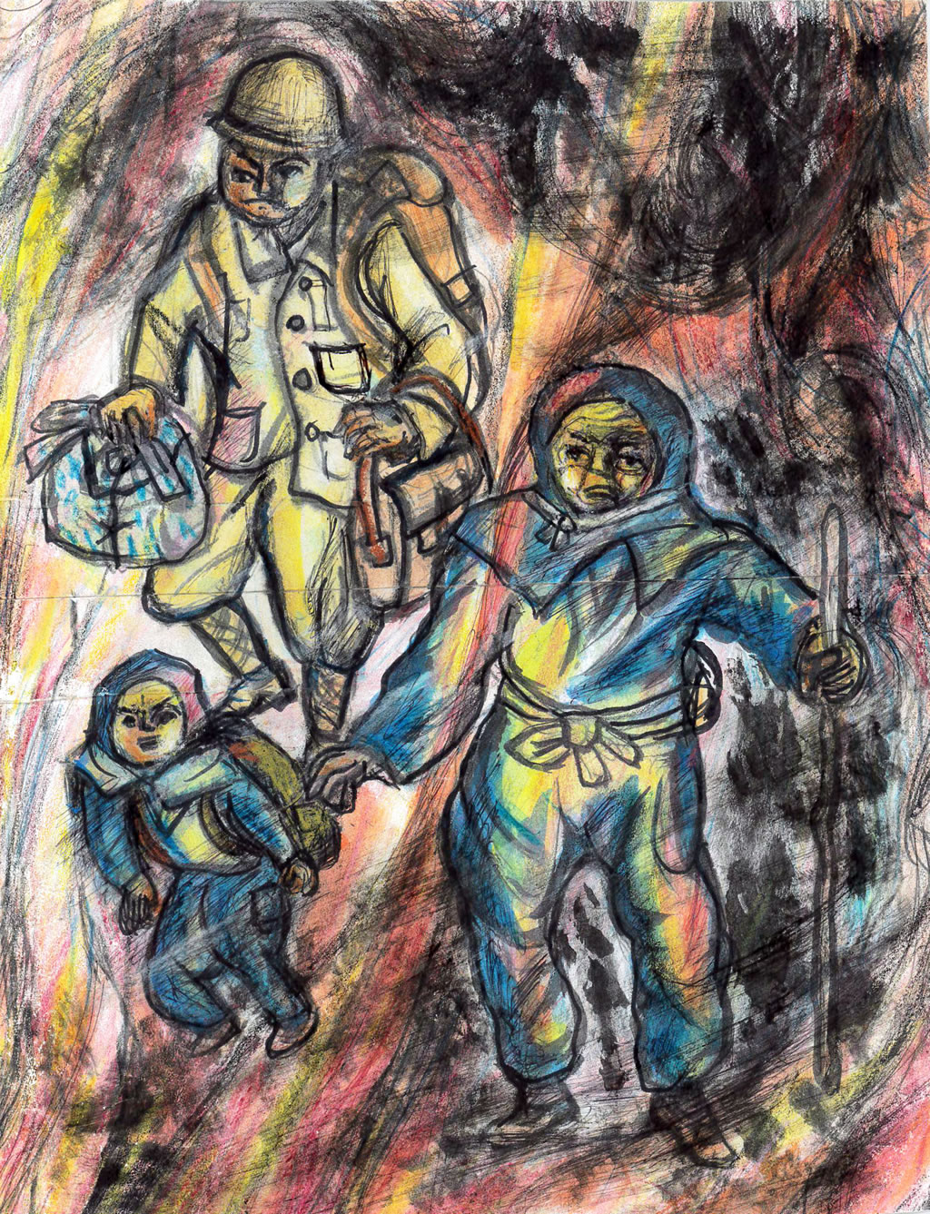 この絵は、その時の忘れがたい体験と印象と心象をもって描きました。しかし、空襲の時の無差別な絨毯爆撃、火に追われる怖さ、悲惨な焼死者、どこまでも続く焼け跡……、自分の筆力ではとても描き切れません。亡くなった方々の無念の思いを察すると、戦争は二度としてはいけないという思いでいっぱいです。