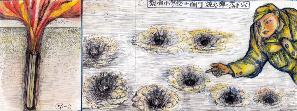 昭和20年5月下旬 焼夷弾の集積所の隣に多くの死体が積まれてあった。自分の家に落ちた焼夷弾を運んだ。そこには、死体と焼夷弾が山と積まれてあった。