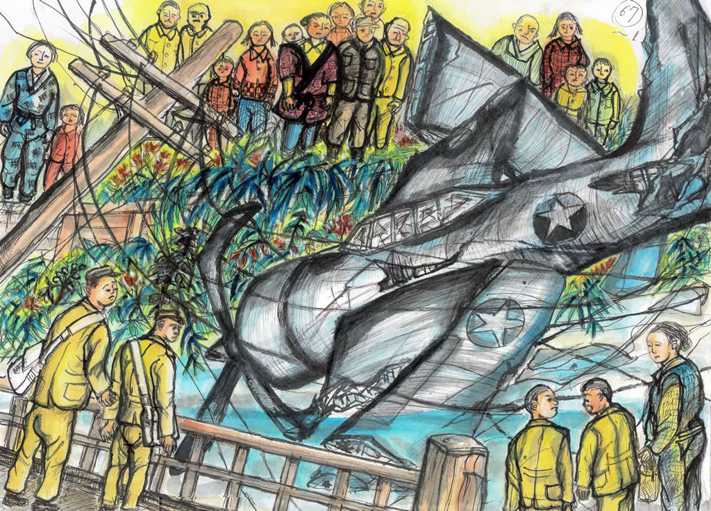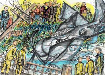 航空兵が生きていた 男性がアメリカ兵を殴らせてと大騒ぎしていた。身内が空襲で死んだとのこと、近所の人が話した。注;戦死か空爆死か不明。記憶がはっきりしていない。